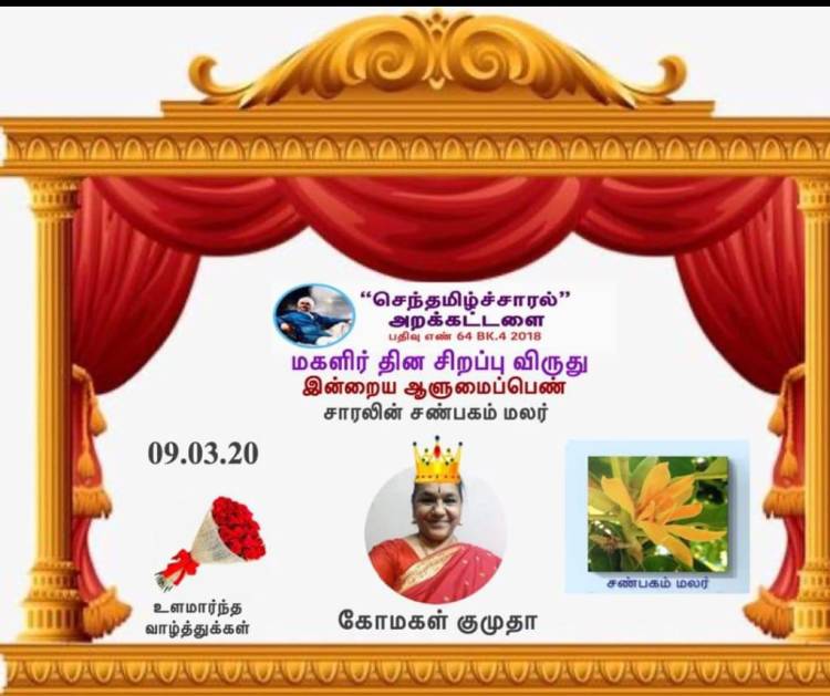 நான் கோமகள் குமுதா. இளங்கலை வணிகவியல் பட்டம் பெற்றவள்.தமிழ்மொழியின் மீது உள்ள அளவு கடந்த ஈடுபாட்டினால் நிறைய தமிழ் மன்றங்களில் பல கவிதைகள் எழுதி சான்றிதழ்கள் பெற்றிருக்கிறேன்Read more