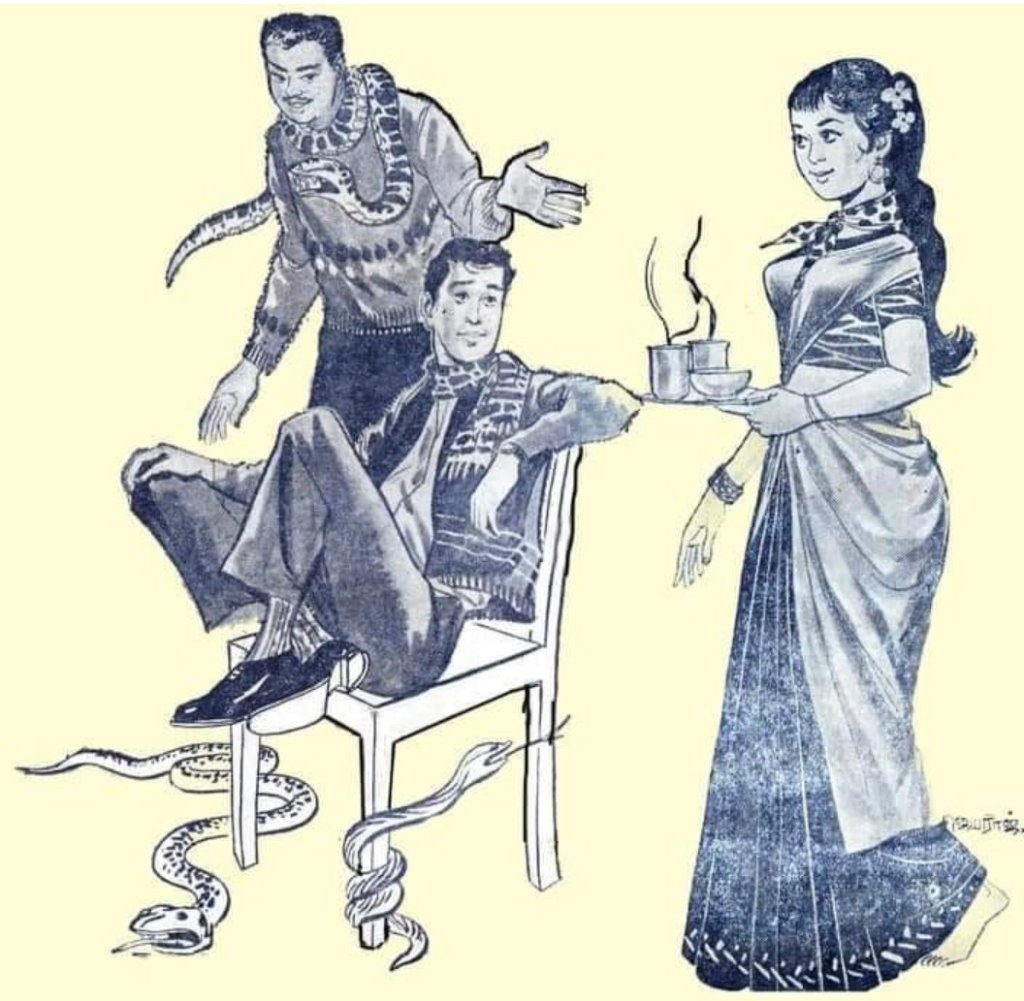 “ஏன்டா பார்த்தி நான் சொன்னமாதிரி நம்ம பாம்பு பிடாரன் ரங்கனை வரச்சொன்னியா?” என்று தன் மகனைக் கேட்ட மரகதம்மாவிடம் ” ஆமாம்மா நீ சொன்னாப்பலே இன்னிக்கி அவனை நம்ம வீட்டுக்கு வரச் சொல்லி இருக்கேன். இன்னும் கொஞ்ச நேரத்திலே வந்திடுவாம்மா. கிருஷ்ணா நீ வா உட்காரு . இந்தா தண்ணி குடி ” என்று தன் அம்மாவின் கையிலிருந்து வாங்கிய சொம்பு நீரை கிருஷ்ணனிடம் கொடுத்தார் பார்த்தசாரதி.